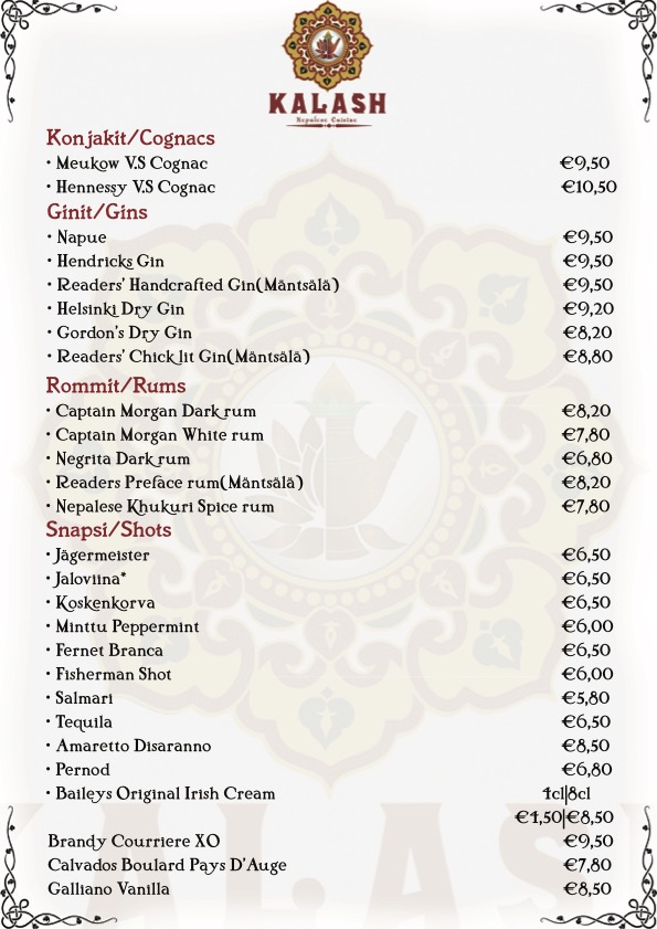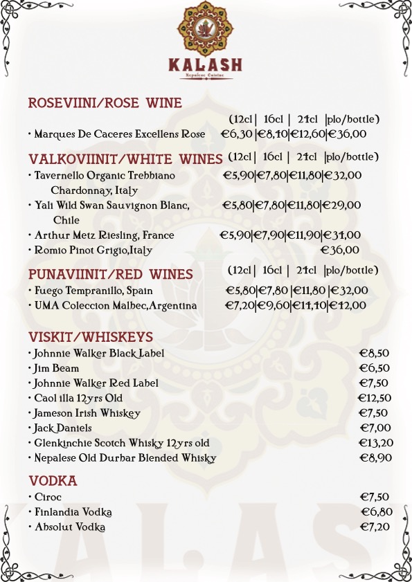Kalash on aito nepalilainen ravintola, jolla on rikas ruokakulttuuri, joka rikastuttaa Nepalin arvoja ja makua. Kalash tarjoaa sinulle aitoja ei-kasvissyöjiä sekä kasvissyöjiä. Ravintoloissamme tarjottu nepalilaisen keittiön maku antaa sinulle halua enemmän kuin jokaisella vierailulla. Asettaessaan vaatimukset hygieenisen ruoan ja maun tarjoamisessa, Kalash on ylpeä siitä, että hänellä on lukuisia uskollisia asiakkaita, jotka ovat yrityksen todellista omaisuutta, ja pyrkinyt siitä olemaan nepalilainen ruokaravintola Suomessa.